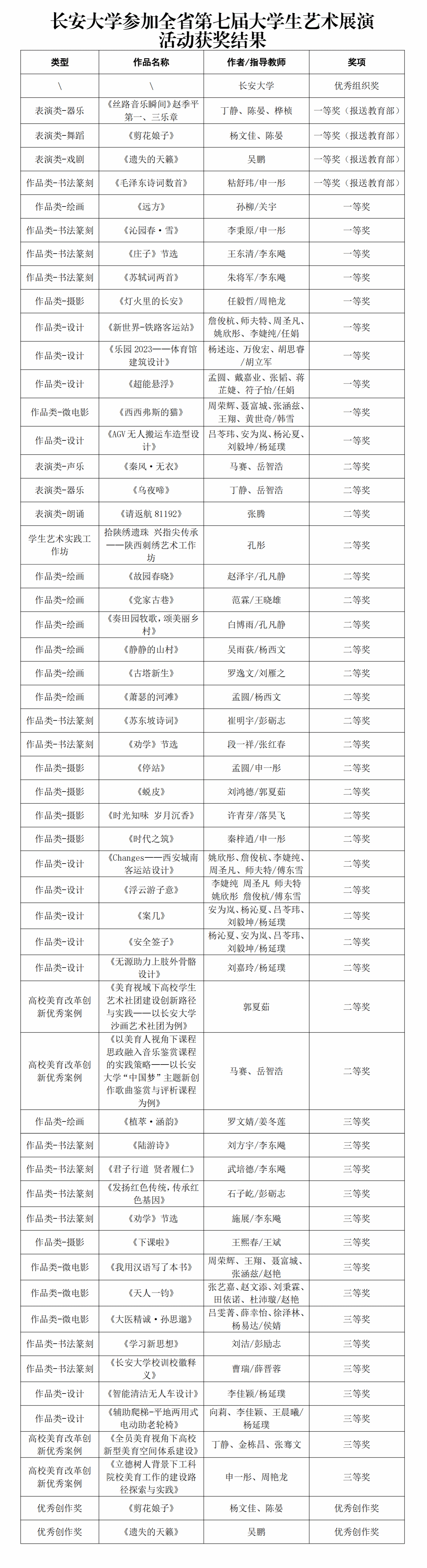 近日,由陕西省教育厅主办的第七届大学生艺术展演活动结束。此次艺术展演中,我集团报送的55件作品获奖,其中包括一等奖14项、二等奖23项、三等奖15项,优秀创作奖2项,学校荣获优秀组织奖。其中4项作品推荐报送教育部,代表陕西省参加全国大学生艺术展演。我集团获奖数量创历史新高,获奖总数和一等奖数量均位于全省前列。