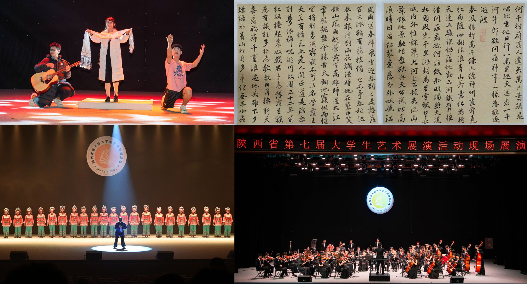 陕西省大学生艺术展演活动是陕西省规格最高、规模最大、影响最广的大学生艺术竞赛,每三年举办一届,是全省高校美育教学成果的一次精彩比拼,也是全省高校文化育人效果的集体展示。本届展演以“厚植家国情怀 涵养进取品格”为主题,共分为艺术表演类、艺术作品类、艺术实践工作坊类、高校美育改革创新优秀案例四大类。