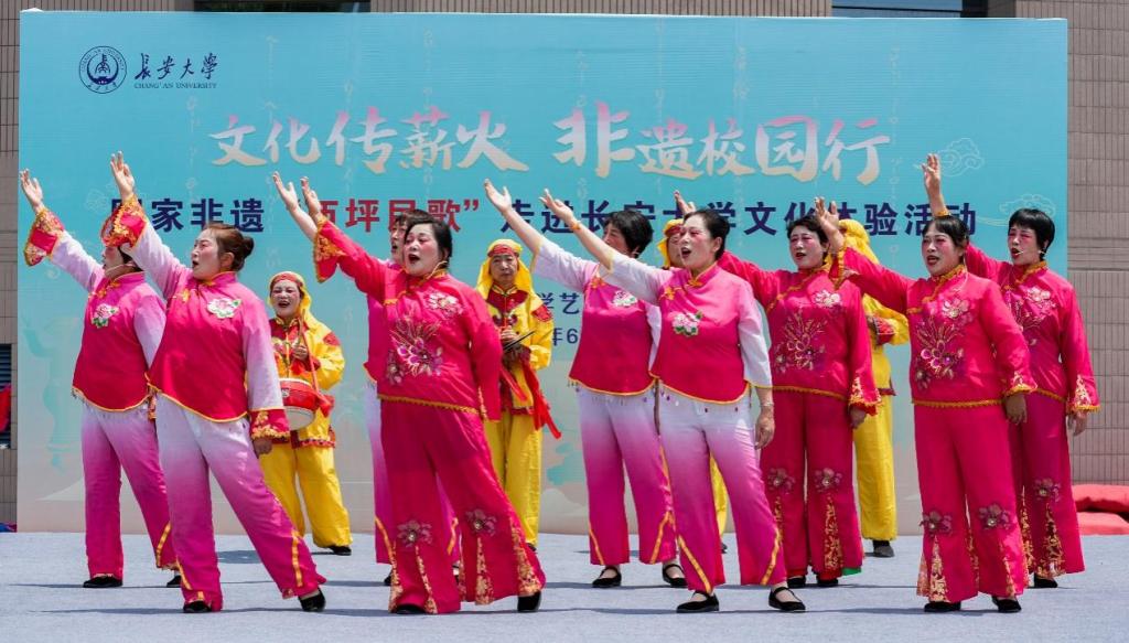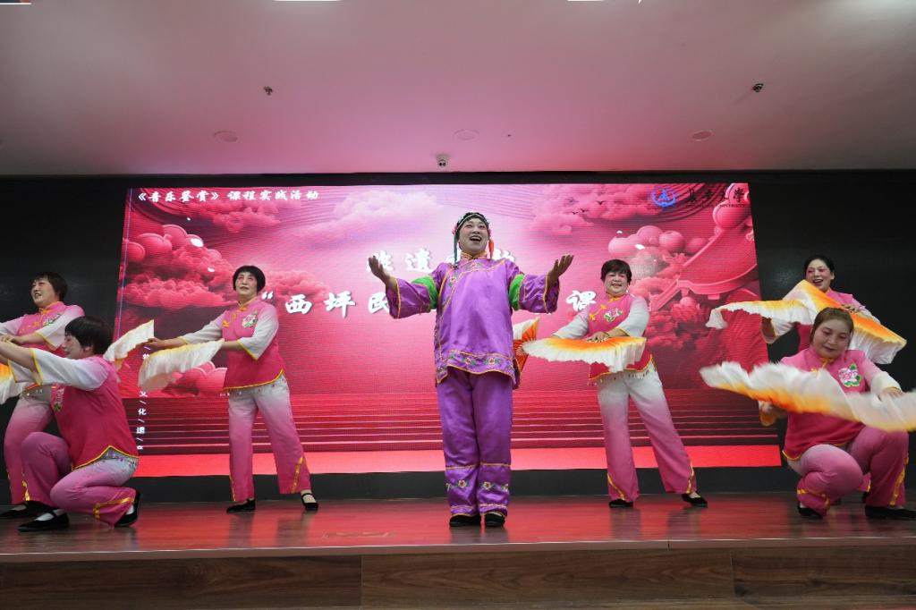 下午4时,非遗进课堂活动在长安文化艺术中心三楼报告厅举行,马赛与西坪民歌演出团队联袂为现场师生带来了一堂别开生面的艺术课程。