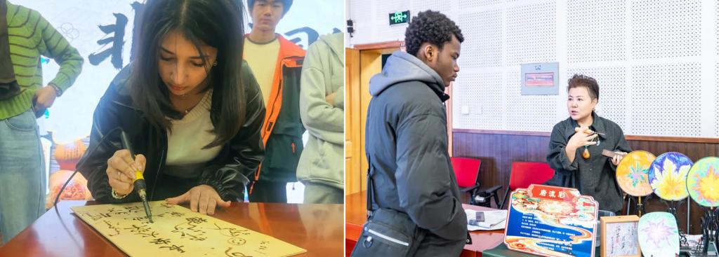 随后的互动体验环节将现场气氛推向高潮。在传承人的亲手指导下,师生与留学生们踊跃尝试。于唐流彩体验区,大家学习调配颜料、控制水流,亲眼见证色彩自然交融形成斑斓画卷;在烙画体验区,参与者们初次执握烙笔,在木板上细心烫刻属于自己的图案。留学生们尤其投入,在动手体验中不断用中文交流请教,感受中国传统工艺的奥妙与趣味。